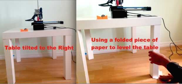 Coloque la moneda en la parte impresa 3D y uso un pedazo doblado de papel para poner debajo de una pata de la mesa y debería ver la moneda hacia el centro, deberá doblar el papel un par de veces dependiendo del ángulo de la inclinación.