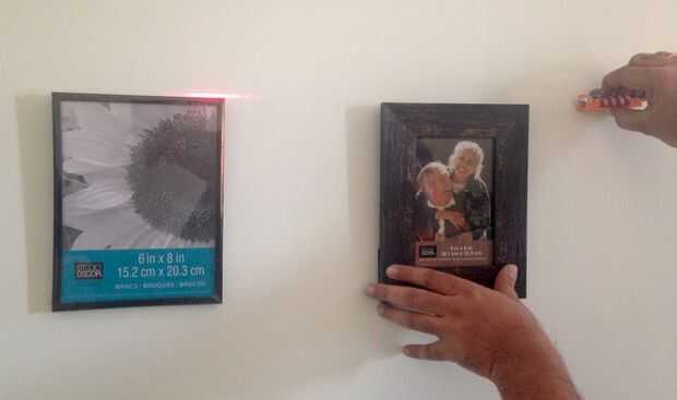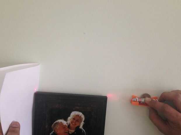 Instale el láser para el nivelador de la moneda y colocarlo en un nivel para que el laser apunta a la parte superior del marco de la cual ya está clavado en la pared como se muestra en la foto de arriba.