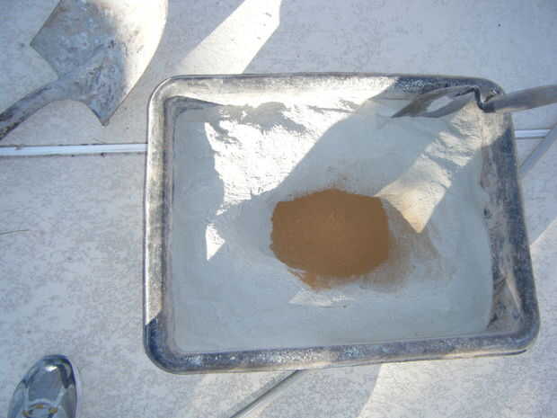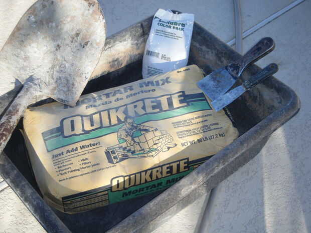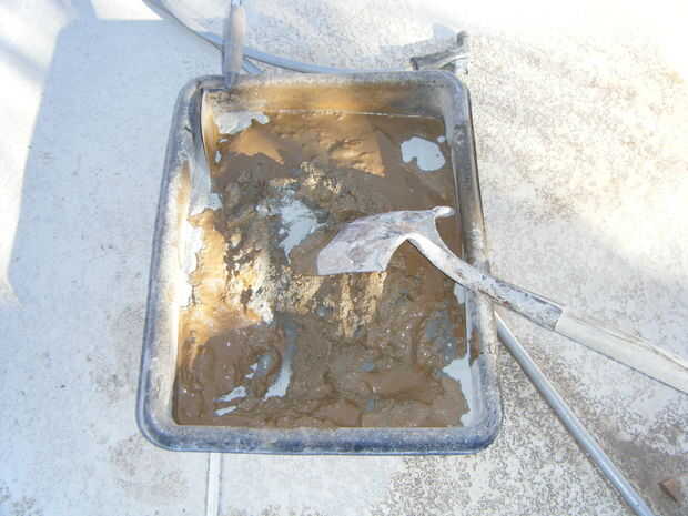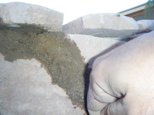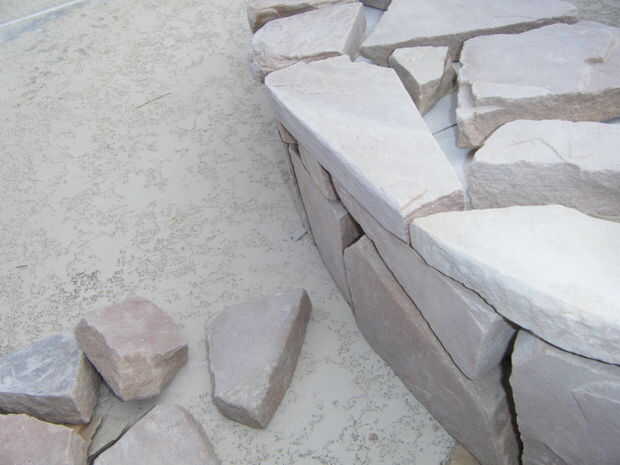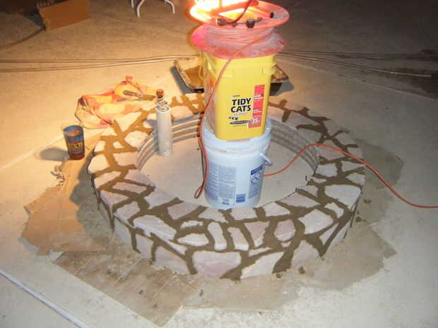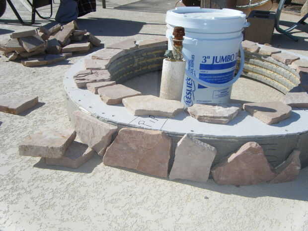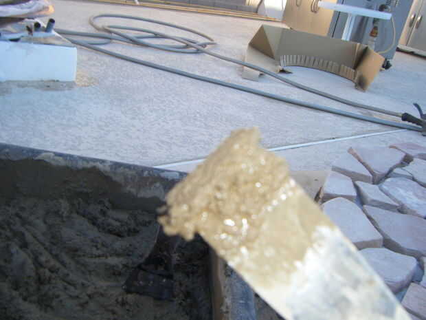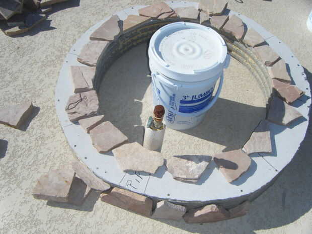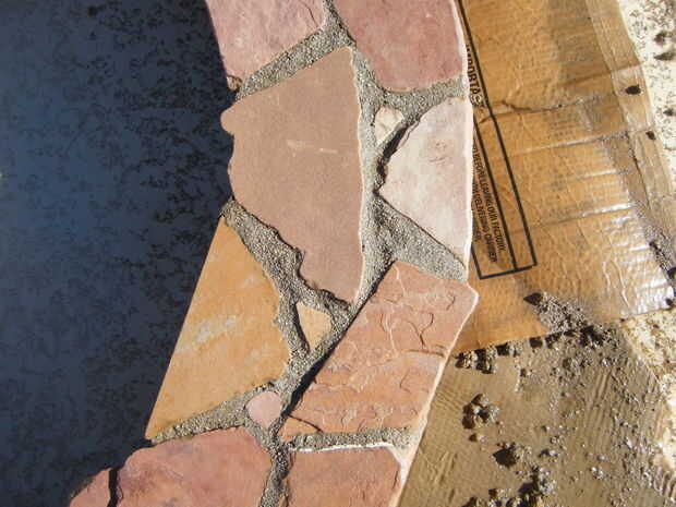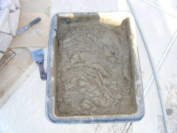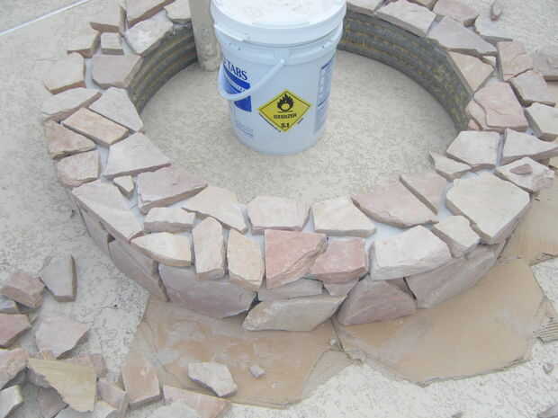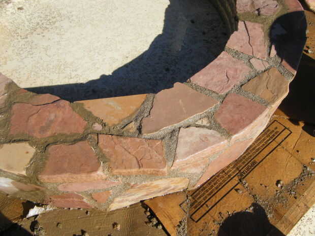Adhesivo de construcción al aire libre de uso para pegar pedazos de losas en la parte superior y los lados del marco.  Utilice cualquier diseño y espaciado que desee.  Para rellenar los espacios más grandes, pegue las virutas de piedra y pequeñas piezas de piedra en los espacios.  Asegúrese de que la capa superior de la piedra traslapa los lados y utilizar una amoladora para moldear las piedras para caber.  Mezclar un lote de mortero utilizando las instrucciones en la bolsa e incluyen cualquier color que desee.  Usando una espátula, los dedos y herramientas pequeñas, llenar las grietas entre las losas con mortero.  Asegúrese de embalar firmemente el mortero en los agujeros.  Cuando el mortero se seca completamente, queremos una base simple y sólida.  No te preocupes de conseguir mortero extra sobre la losa, limpiará el más tarde.  Cuando lleno todos los huecos, que el mortero seque durante la noche.  Cuando el mortero está seco, usar ácido muriático y cepillo de cerdas suaves para barrer el exceso de mortero de la losa.  ATENCIÓN *** Asegúrese de leer todas las instrucciones y use ropa protectora y gafas al manipular ácido muriático.  Es muy peligroso, pero puede ser manejado con seguridad cuando usted sigue todas las instrucciones y advertencias de seguridad.  Si no está seguro sobre algo, buscar en la web antes de continuar.  Cuando termines todo el mortero de la losa, manguera de limpieza de una vez para limpiar el ácido restante, y la base está completo.