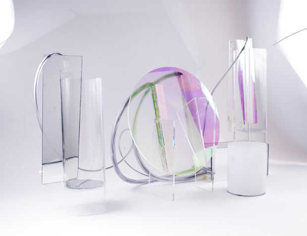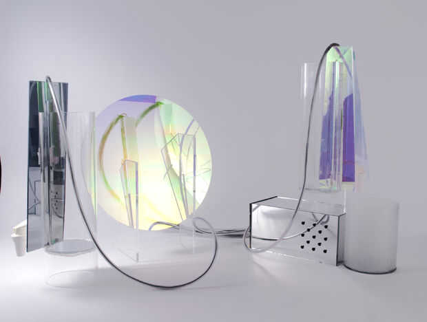 El holograma futurista y materiales reflectantes están inspirados en la música electrónica los juegos del instrumento. Utilizar material translúcido para enfatizar la reflexión del agua, la luz y la sombra.
