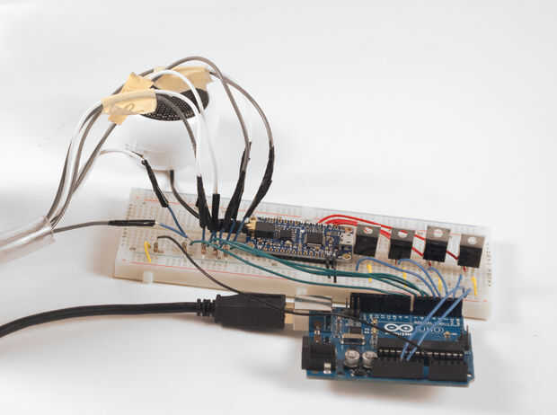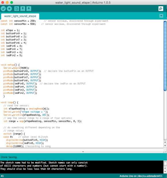 El primer paso es desconectar en eTape en tu protoboard y utilizar el código siguiente para activar el sensor. Hay dos cosas importantes que necesita saber antes de empezar. En primer lugar, ya que la cinta detecta las distancias diferentes del líquido por la compresa de la presión hidrostática del sensor, la dimensión del contenedor afecta la presión. Por lo tanto, usted debe para probar la cinta con el contenedor que está utilizando para obtener la lectura exacta. En segundo lugar, la eTape trabaja eficaz y con precisión sólo cuando es plana y recta. Como resultado, se debe adjuntar la cinta al contenedor otro material plano y rígido con cinta adhesiva de doble cara, para conseguir la cinta para que funcione correctamente.