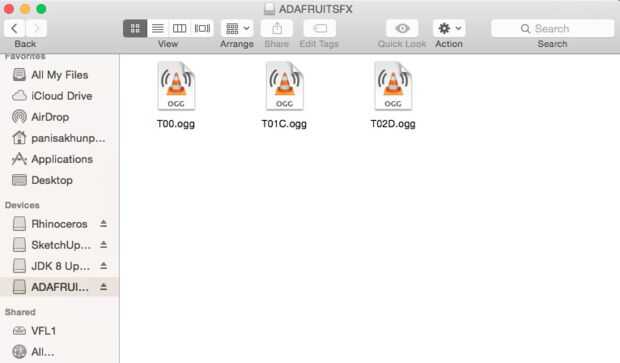 He descargado de mp3 de fuentes abiertas. Entonces utilicé http://media.io para convertir mi archivo de mp3 a OGG. Cuando Adafruit soundboard está enchufado en el ordenador, puede arrastrar los archivos en la unidad. Cambie el nombre los archivos como T00, T01, T02, T03.