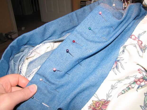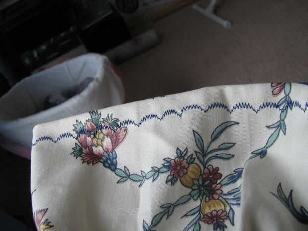 En la parte inferior de la falda para el dobladillo. Mis conocimientos de coser por encima son un poco mediocres como líneas rectas, por lo que he sido optar para utilizar uno de los puntos decorativos en su lugar. A continuación, renglones torcidos no son realmente notables. Tengo el hierro y tabla de planchar para este uno y presiona el dobladillo a donde quería y puestas en su lugar (tiempo de regla si desea asegurarse de que su nivel inferior es el mismo que el centro dos). He recogido mi puntada y funcionó la puntada con la parte superior de la falda hacia arriba. Recuerde que aunque la falda es ahora casi un círculo, el borde inacabado todavía es un rectángulo. No hay curvas de recorte necesarias!
