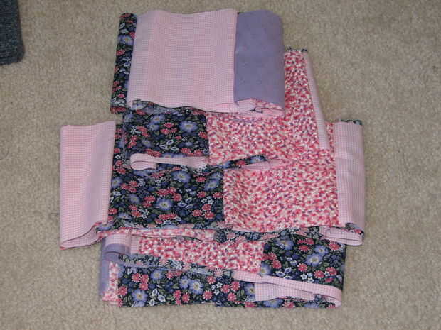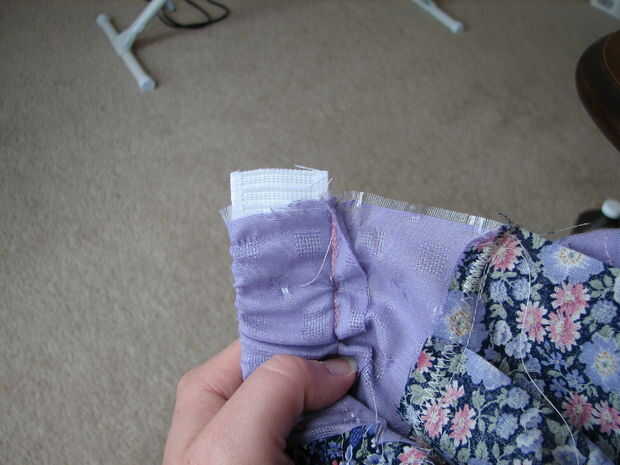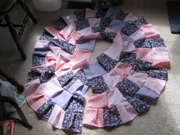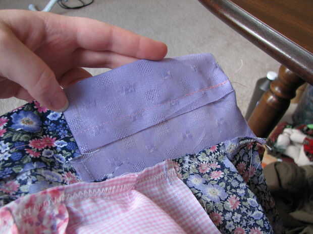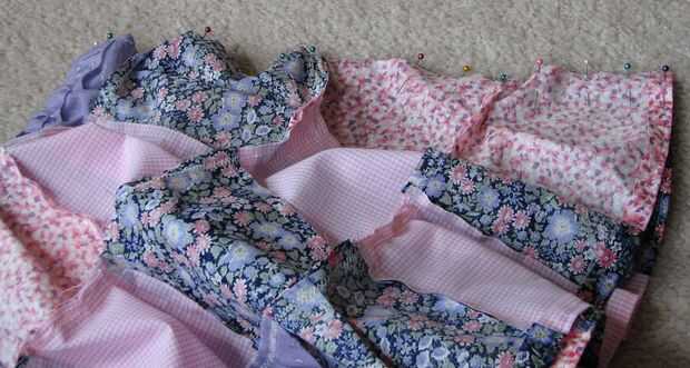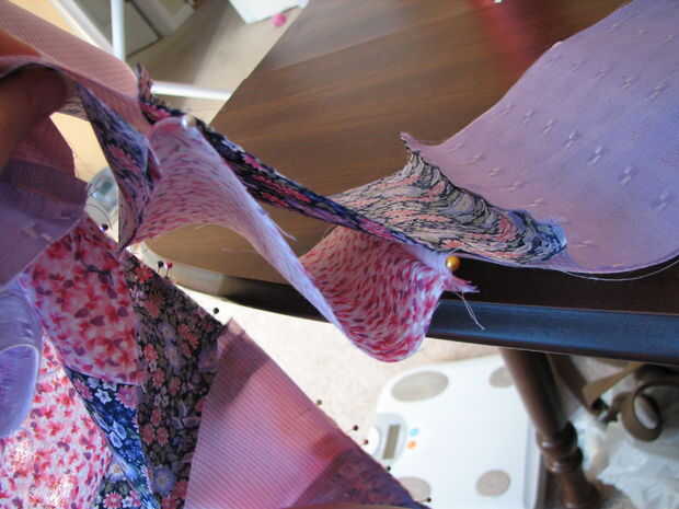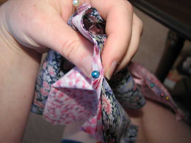 En lugar de reunión (pensé que pasando por las costuras cada 5.5" haría reunión tratando bastante un poco más), optado por pin por mitades. Con derecho cubrió los extremos juntos. Encontrar el medio de ambos niveles, juntos del perno. Encontrar el medio de cada mitad, pin, medios de las secciones, perno nuevo (cuadro 3). Mantener a la mitad hasta obtener un espacio te gusta el aspecto de (véase la foto 4 de mina). Después sólo dobla el piso sobrante y cubrió, para que las aletas iría hacia mí cuando siendo alimentada a la máquina de coser (para que no se deje llevar por los pies mientras se alimenta en). He cosido y zigzagueaba como antes. Esta vez alrededor, por lo que podría tratar de un método diferente, hice el dobladillo y hecho un bolsillo en la parte superior de la falda para el elástico, tiró del elástico a través de la bolsa y luego cosida por el lado. Mi esposo y yo llamamos «Strawberry Shortcake».