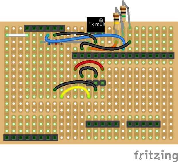 Esta tabla es 'layer 3' de la pila, donde se conectan las fuentes de alimentación de 5v y 12v y 12v es impulsado hacia arriba a 170v a través del módulo de alto voltaje DC-DC boost. Como lo hizo en soldar la tarjeta multiplexora, usted necesitará hacer un poco de corte y grabado/raspado para preparar la Junta de tira para soldar los cables y componentes.