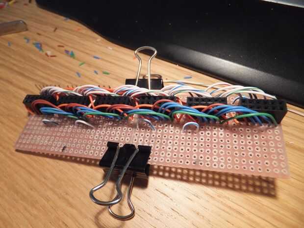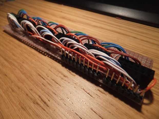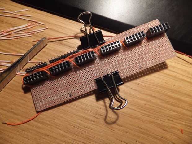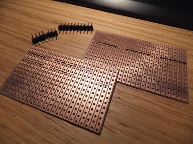 A continuación la tablilla, que es un circuito independiente que no forma parte de la pila. Las conexiones se harán de las cabeceras en el tablero de energía a la tablilla de anuncios a través de cualquiera de los dos cables de puente macho-hembra o tal vez usando modificado conectores de cinta. Como lo hizo en la tarjeta multiplexora y tableros de alimentación de la soldadura, usted necesitará hacer un poco de corte y grabado/raspado para preparar la Junta de tira para soldar los cables y componentes.