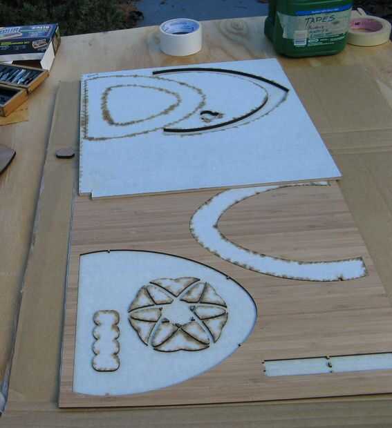 Ponoko tiene vector archivos gráficos; He hecho mía en Inkscape. Si no estás familiarizado con Inkscape, lo recomiendo. Hay un puñado de buenos tutoriales por ahí que te enseñará a utilizarlo. Hay dos archivos para esto, uno es para la madera de color clara (bambú) y uno es madera oscura (nogal enchapado mdf). Los archivos de luz no totalmente hasta la fecha; unos agujeros hay que agregar para el interruptor de la perilla y el gato. También, los pedazos de oscuro detalle en el diseño son un poco demasiado grandes para caber sin algunos ajustes. Puedo trasladarme a los que modifica uno de estos días.