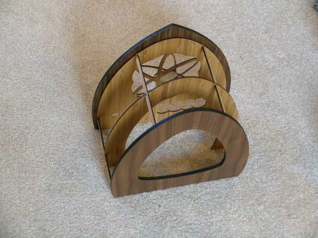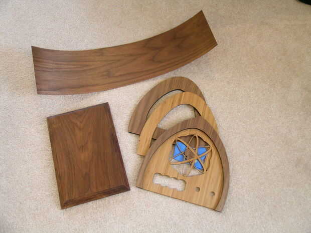 En primer lugar, pegué las inserciones de nogal al frente de bambú. La pegué el marco de la nuez a la pieza frontal. Pegué los puntales en el apoyo medio, luego los puntales a la Asamblea delantera, y luego pegué la espalda a. Como un apoyo para el diseño central, encontré una interesante pieza de chapa de cobre perforada. He cortado a la medida con unas tijeras y pegado unas fichas para mantener en su lugar.