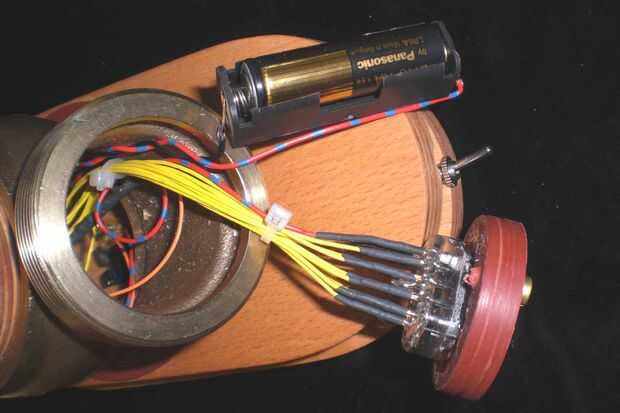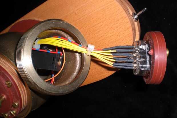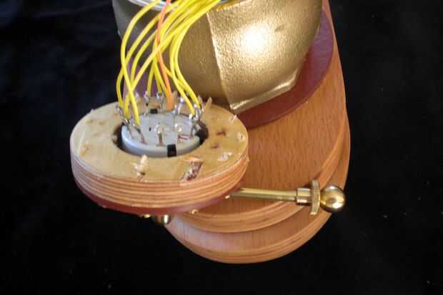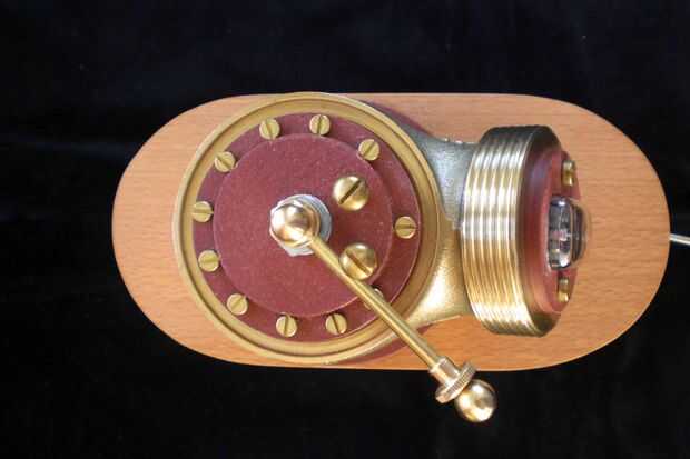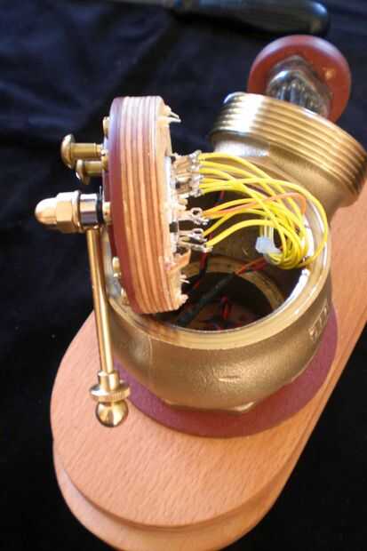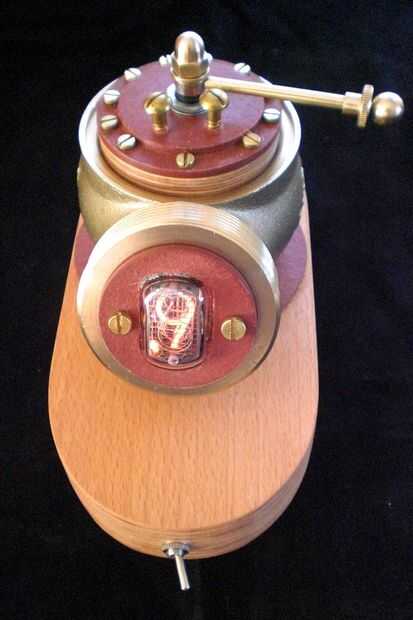 La parte superior ver el interruptor de 10 pasos y en frente allí brilla el tubo del Nixie del ONT. Los pequeños tornillos en la parte superior solamente muestra la posición del interruptor. Los mayores deje de la manivela.