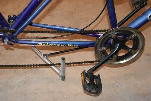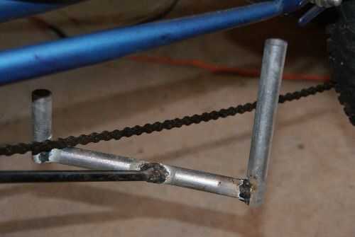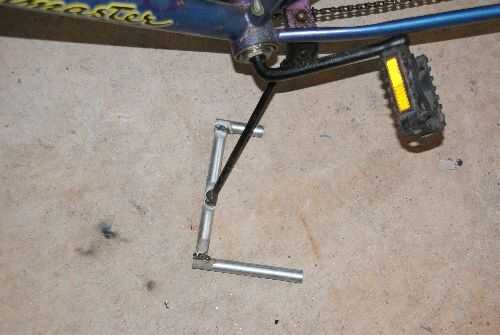 Baje el pie de apoyo y coloque un trozo pequeño (alrededor de 4" de largo) de 1/2" EMT en ángulo recto con el tubo transversal como se muestra en la foto #1. El tubo de ángulo recto en lugar de la tachuela. Compruebe la posición y luego soldar sólidamente. Foto #2 muestra el pie de apoyo en la posición superior.