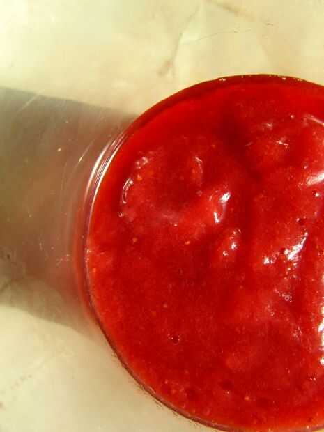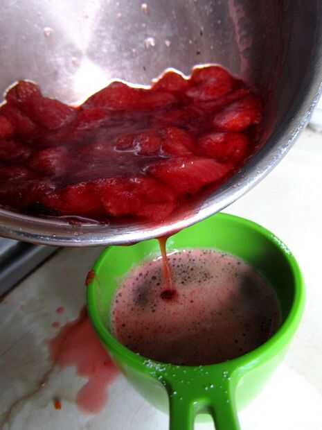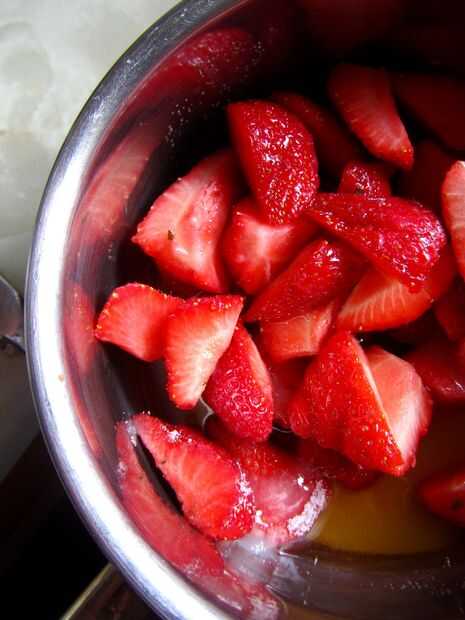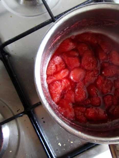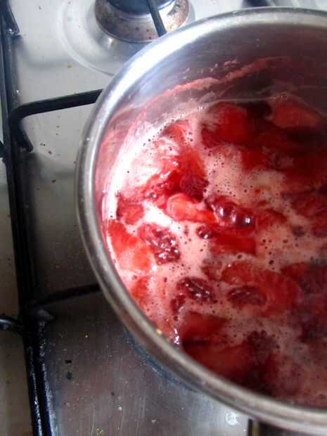 Ponga la cacerola a hervir, luego gire hacia abajo y y dejar cocer a fuego lento alrededor de cuarto de hora, hasta que ha pasado la mayor parte del líquido. Si en este momento todavía hay mucho líquido, escurrir. Este ca se utiliza como un magnífico jarabe de fresa, en cócteles o verter sobre helado.