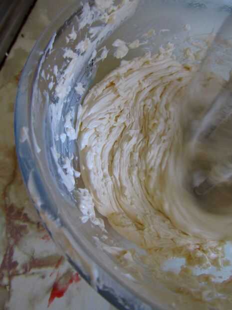 En algún momento después de agregar la mantequilla, el betún parecerá un lío cuajado de huevos revueltos. Esto es normal. Poder a través y seguir batiendo y la confianza que se darán cita.