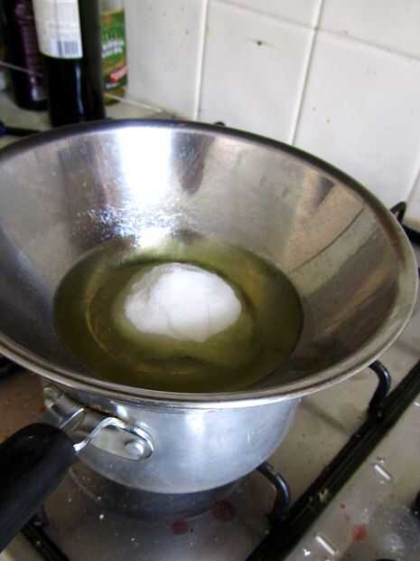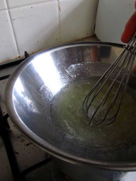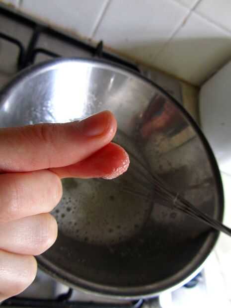 En primer lugar, instaló su doble caldera (o combo de tazón de fuente pequeño cazo), sobre el calor con una pequeña cantidad de agua en el recipiente inferior. Asegúrese de que el agua no toque el fondo del tazón usted. Poner las claras de huevo y azúcar en el recipiente superior y les bate continuamente a fuego lento hasta que el azúcar completamente disuelto. Prueba tomando una pizca de jarabe y roce entre el pulgar y el dedo. Si se siente valiente, mantenerlo al fuego un poco más.