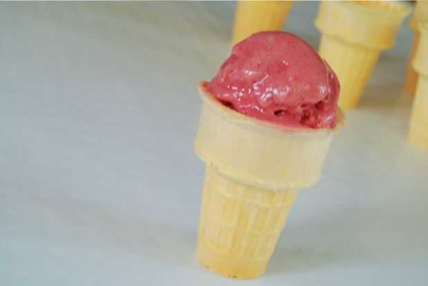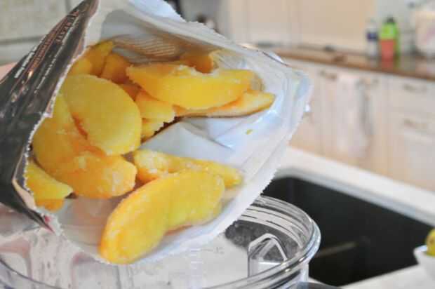 Se mezclan 1 bolsa (10 onzas) de frambuesas, 1/2 taza de duraznos congelados, 1/3 de taza de agua y 1/3 taza de azúcar. Pulso hasta que esté picado, entonces continuamente mezcla hasta que sea liso, como el helado suave del servicio. Me realmente recomiendo congeló y recoger más tarde, pero si no tienes la paciencia, a comer!!!!