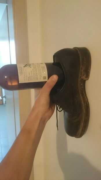 poner la botella en el zapato (como en la imagen) y presione la botella con el talón del zapato contra la pared (repetidamente). Mejor usar las dos manos ;)