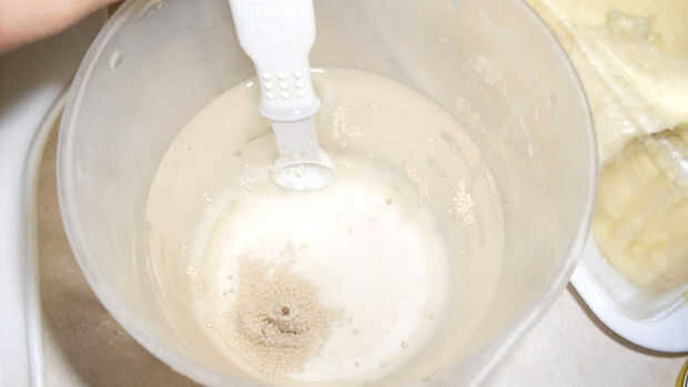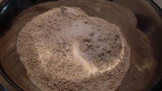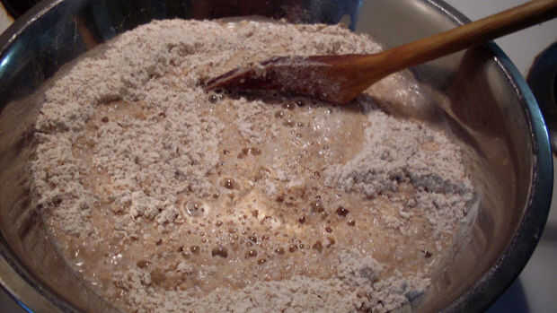 Revuelva la mezcla en el agua y vierta inmediatamente a la mezcla de harina, revolver con cuchara de madera hasta que se mezcle bien