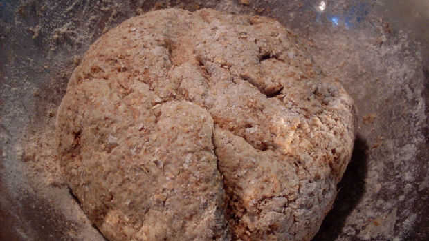 Su trabajo superficie y volcado de la masa del tazón en harina, al revés de la capa de harina y lados luego coloque la masa en la olla de hierro fundido y coloquen la tapa nuevamente