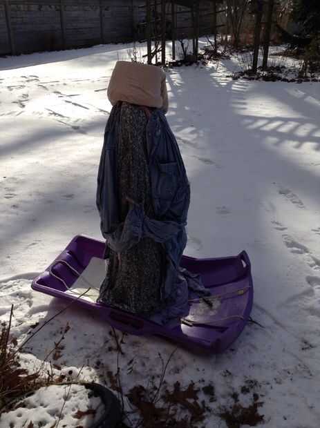 Cubrí los marcos con una hojas húmedas, tipo de girando alrededor del marco para anclarla en el trineo, así como suavizar la forma. Yo el vestido drapeado sobre esta forma ligeramente cónica, puesto la camisa sobre eso. Las mangas de la camisa es necesario los pines ropa para mantenerlos en su lugar hasta que congeló. La cabeza me envuelve el contenedor de helado en una toalla de mano (para cubrir la publicidad) y había cubierto con una camisola (para el efecto de tono de carne). Fue un poco complicado conseguir esto a permanecer en el lugar, pero un poco de agua extra y unas cuantas palabrotas ayudado.