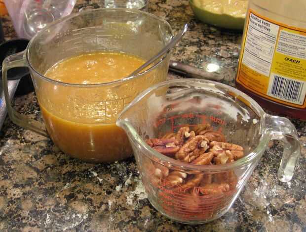 La adición de Borbón en este pastel le da una buena patada! Aunque el alcohol cocinar apagado mientras se hornea el pastel puedes omitir este ingrediente para un pastel de pacana clásico.Servir con helado de vainilla o crema batida.¡ Disfrute!Paso 1: