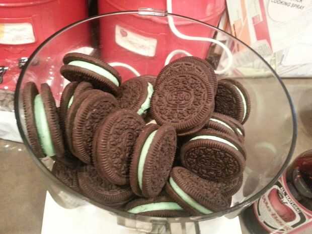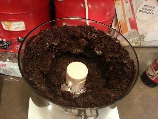 Lo primero que quieres hacer es desmoronar las cookies. La forma más sencilla que he encontrado para hacer esto es lanzar en un procesador de alimentos y les pulso hasta que son más de una textura de tierra. Pulso funciona mejor para esto y tarda unos dos minutos o así todos para conseguir una trituración uniforme.