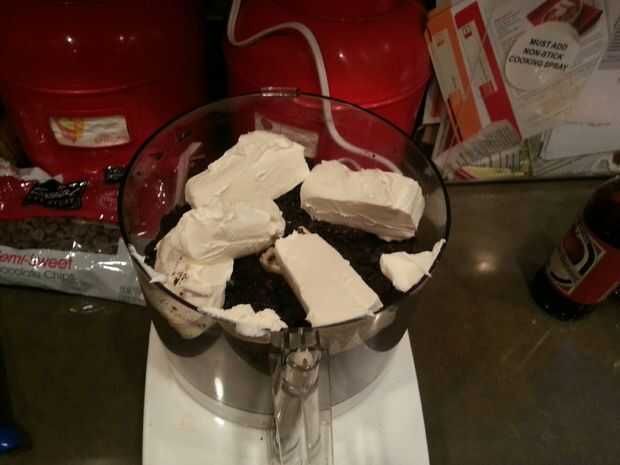 Una vez que las cookies no se parecen a las galletas y han asumido una decididamente "tierra" aspecto, añadir el queso crema. Me gusta cortar el bloque en trozos más pequeños y que ligeramente cálido que hace mezclar para arriba mucho más fácil. Sólo hasta su procesador y volver a pulsar durante unos dos minutos o menos, haciendo una pausa de vez en cuando para raspar los lados.