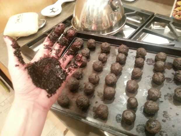 Usando a su baller de mellon, sacar con pala encima de pequeñas bolas de su barro frío y rodar entre las manos pequeñas bolas de forma de genialidad menta oscuro. Porque tus manos son calientes y nuestro barro está frío, se pegue en tus manos un poco, pero sólo mantener enrollado en bolitas uniformes. Tengo alrededor de 2 docenas de esta receta y todavía tenía suficiente en el recipiente para justificar otra ronda de pruebas de sabor de control de calidad.