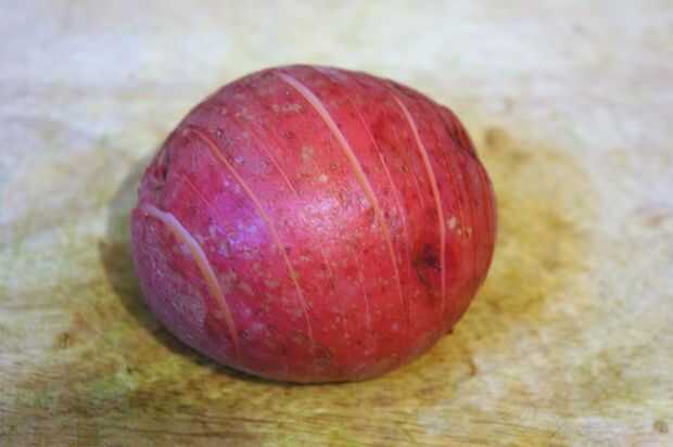 Cortar la patata mientras está descansando en los lápices le evitará cortar la Copa por la mitad.