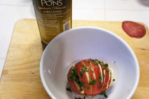 Coloque las astillas pequeñas de ajo entre las rebanadas en la patata.