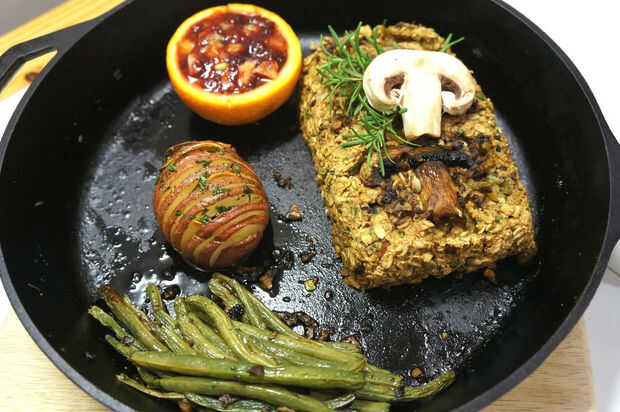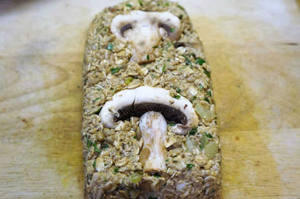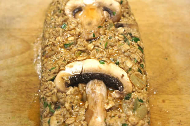 Colocar un par de setas enteras en la parte superior de la barra de pan y verter algunos del caldo de verduras por encima.