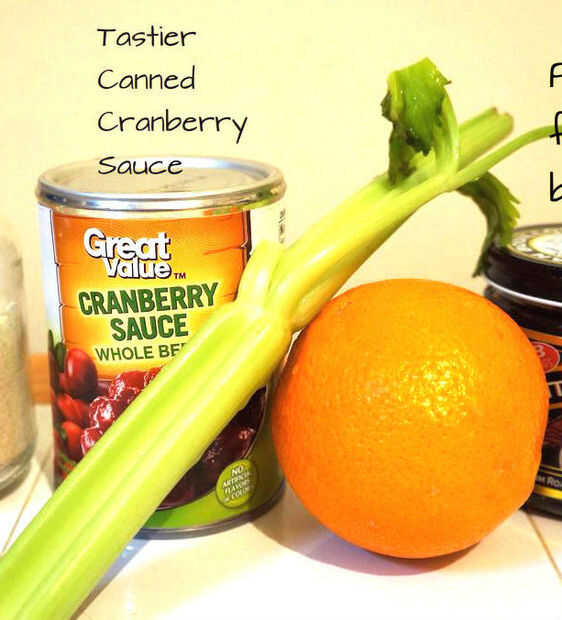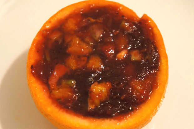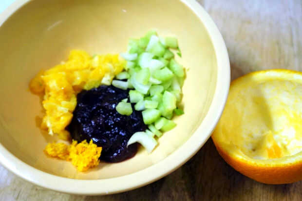 Añadí los pedazos de apio picada, naranja ralladura y naranja (al gusto) a la salsa de arándanos y lleno de una cáscara de naranja (plato). Puedes hacer tantos como quieras; usando la cáscara de naranja para un tazón de fuente.
