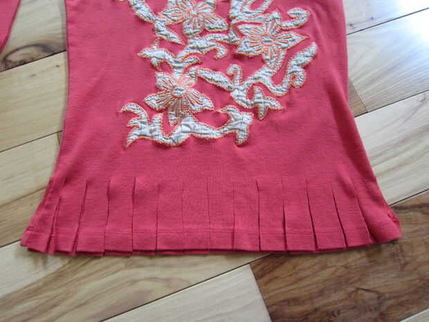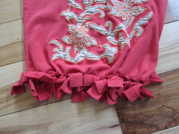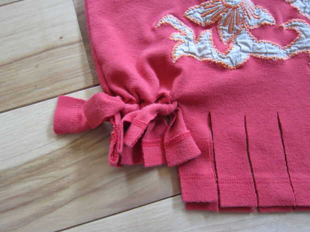 En la parte inferior de la camisa de corte ranuras sobre cada pulgada a través de ambas capas (longitud dependerá del tamaño de la camisa por lo que tendrá que hacer la llamada) lo suficientemente largo que podrás atar dos veces. Recuerde que la camisa se estirará con el peso así que trate de asegurarse de que su bolso no va a pasar a sus pies con llenos de golosinas!