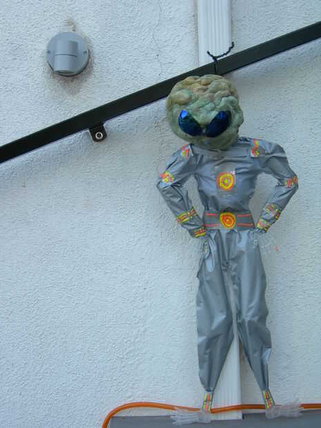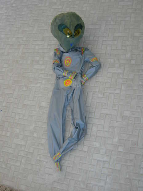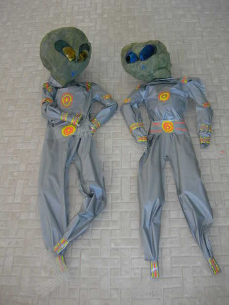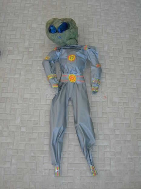 Hice los trajes de vuelo envolviendo cada cuerpo en una plata manteles plástico del partido suministro de tienda, y luego recortar al tamaño y engrapado a lo largo de las costuras. Los trajes están decorados con pintura de arte, que agrega color, dimensión y brillo.