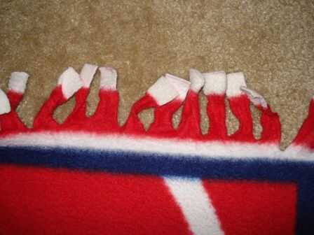 A continuación, estará cortando los lazos o flecos de la manta. Usted debe cortar verticalmente en el paño grueso y suave alrededor de 1 ½ ½ a 2 pulgadas, el mismo que utiliza para cortar las esquinas. Debe cortar los trozos de tejido al cortar los lazos para que tenga la misma cantidad de lazos a cada lado.