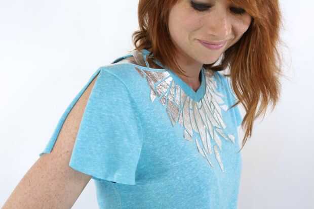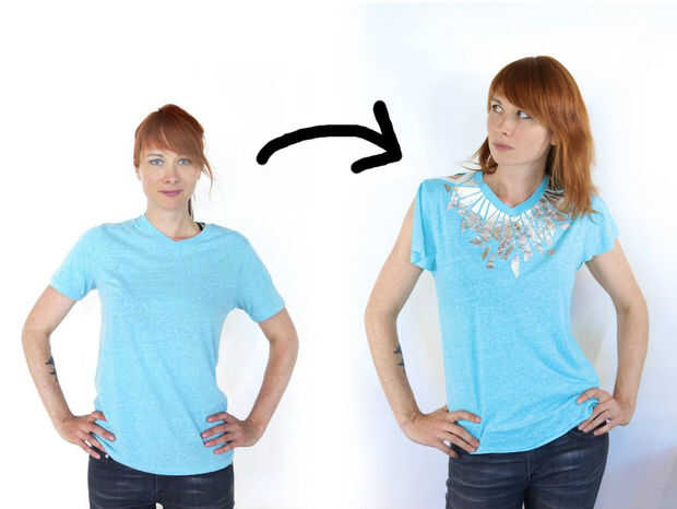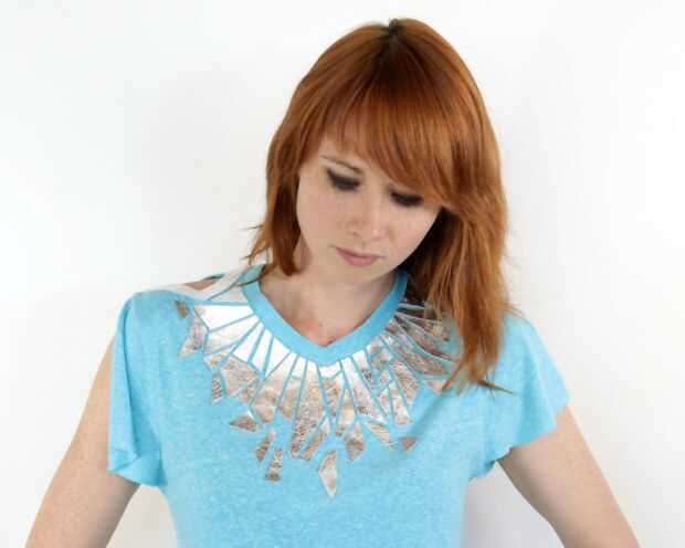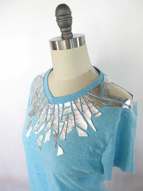 A su vez una aburrida camiseta en un top elegante adornado con este fácil no-no cosa técnica. Todo lo que necesita es un pequeño trozo de cuero fino y algun pegamento de tela fuerte. Variados colores y texturas de cuero dará su diseño parece diferente, pero creo que esta técnica parece especialmente agradable con una piel metálica ya que crea un efecto como un vidrio roto, una bola de discoteca o uno de esos tatuajes flashes metálicos que todo el mundo lleva este verano.