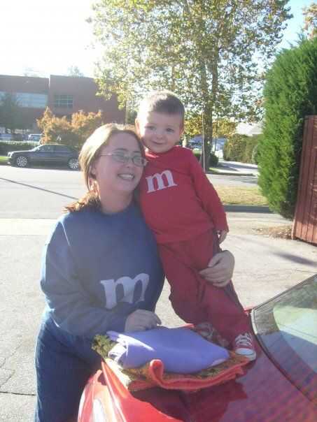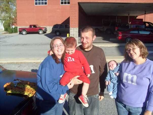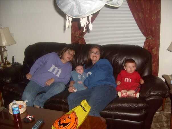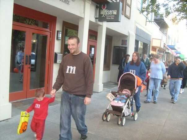 Esto es barato y fácil. He hecho camisas para mi esposo, hijo, hermana, sobrina y yo. No pudimos encontrar una camisa sólida en el tamaño de mi sobrina, así que consiguió una sudadera con capucha y el corte por la mitad y uno a cada lado de la cremallera. Todos juntos fuimos un "paquete de M & Ms".