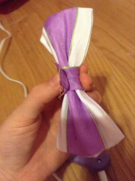 Envolver ese pequeño trozo púrpura alrededor de la parte que dobla en la proa y luego encolarla