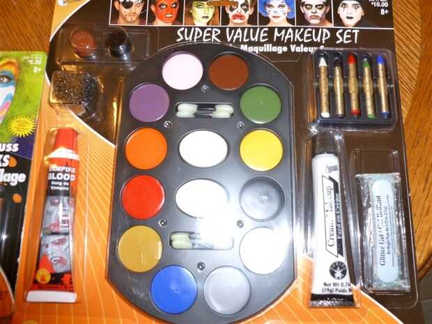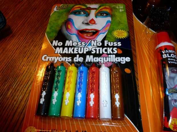 - Dos comprar kits de maquillaje de Halloween, los colores que usé eran púrpuras, gris, rojo, amarillo, blanco y negro