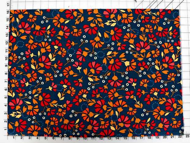 A partir de ahí, decidí que quería mi mantel final dimensiones que 18 X 24 pulgadas. Se trata de un tamaño estándar de mantel. Me di a un margen de 1 pulgada todo el camino alrededor de la cual se dobla y planchado. Así que corte mi tela 20 X 26 pulgadas