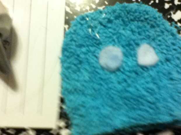 Cortar el blanco se sentía en un semi círculo.  Pegue los círculos blancos de la pequeños a la mitad superior del cuerpo.  Luego cortar el fieltro azul en un círculo más pequeño y el pegamento blanco.