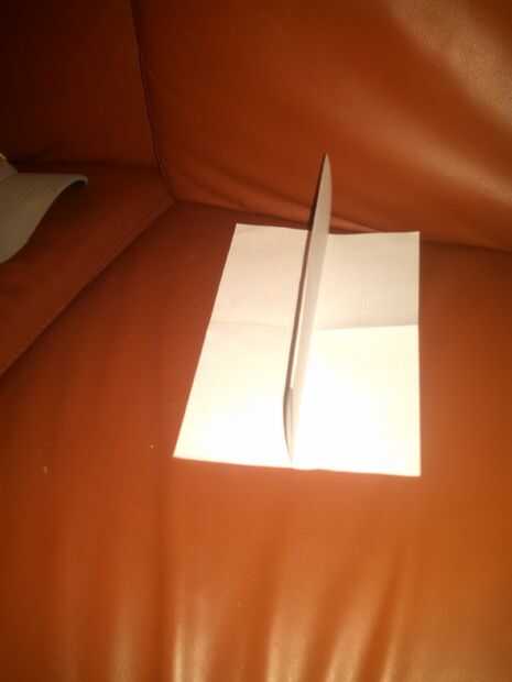 a lo largo de ese primer doblez por la mitad del papel, cortar o desgarrar a lo largo de la foldfrom del centro hacia la parece. habrá una abertura en medio de la página, no el exterior y el corte es una línea recta.