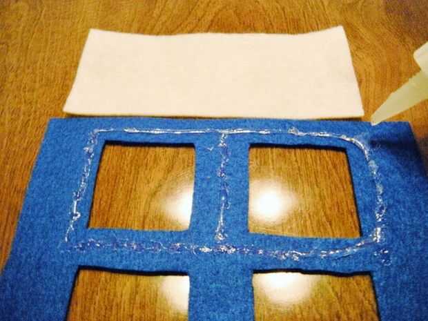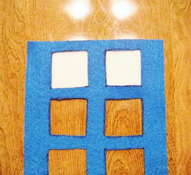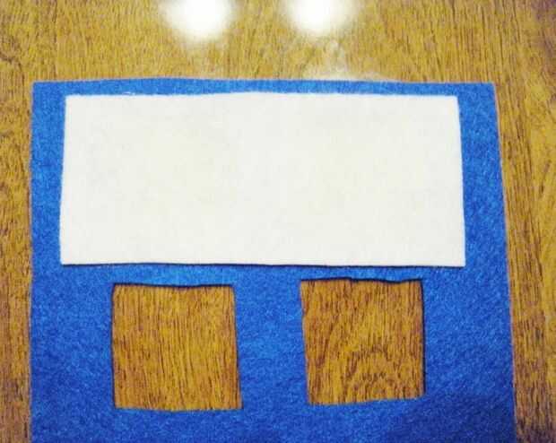Pegar este pequeño rectángulo blanco en la parte posterior de la pieza de fieltro azul detrás de las ventanas.