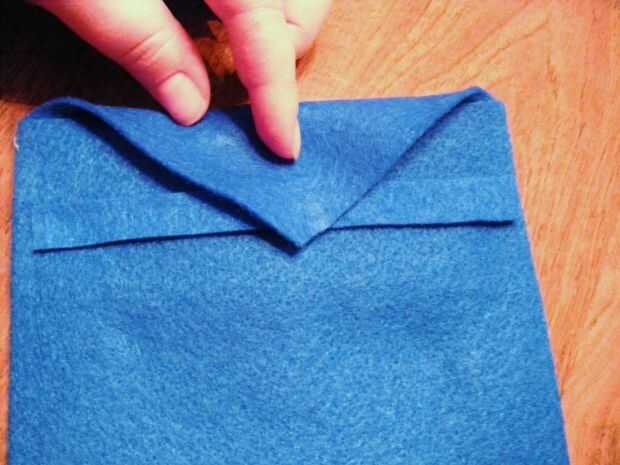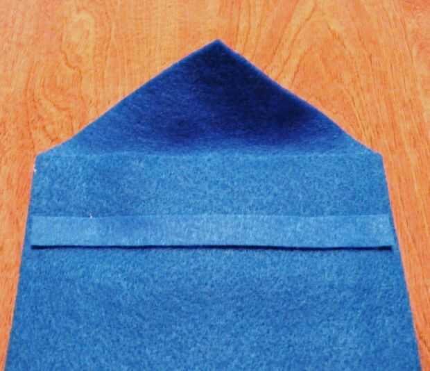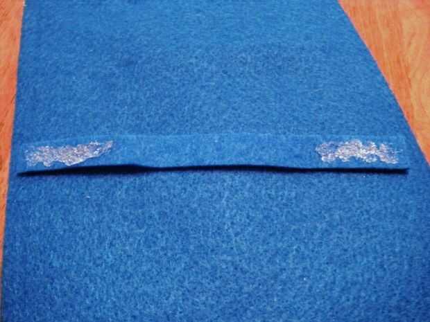 De algunos de su fieltro de desecho azul, vas a cortar una tira fina de pegamento en la parte posterior de la caja. Se trata de la tira de fieltro que el botón se remete debajo para cerrar el caso. Adhiera esta tira bastante cerca de la cima, cerca de 1-1.5 pulgadas para que el botón será capaz de llegar a él.