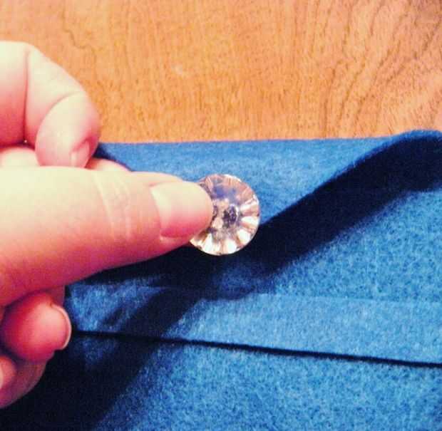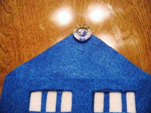 En la parte superior de la T.A.R.D.I.S. es una especie de lámpara o luz. Pensé que sería lindo incorporar en este caso como un método para cerrarla. Así que escogí un botón brillante, claro para que tipo de se asemejó a la luz y había pegado a la parte superior del pico/triángulo. En la última foto puedes ver cómo funciona para cerrar el caso con él.