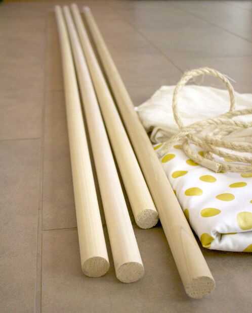 4 espigas (opté por 6 pies tacos largos encontrados en el Departamento de moldeado de lowes, en lugar de los típicos pies 4 clavijas que el tipi todo tendría más pies cuadrados dentro de)