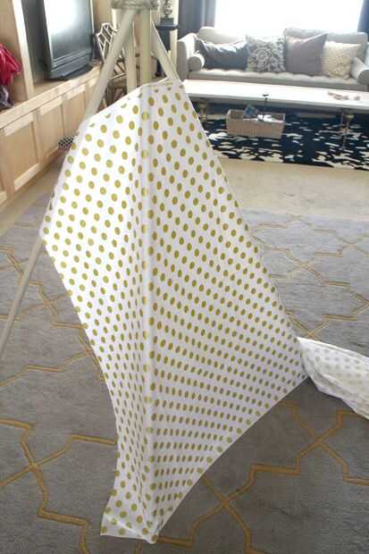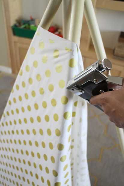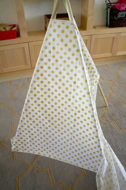 Porque esto es un no-coser proyecto, querrá prestar atención a este paso. Utilizado ambos extremos de la anchura (54 pulgadas) de la tela de algodón para que la parte inferior y superior de los norteamericanos no tendrían que ser dobladillado, y funcionó la longitud de la tela alrededor del marco del tipi.