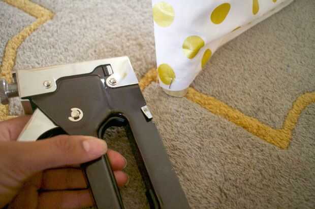 He trabajado uno / pasador de lado a la vez, asegurándose de que el borde inferior de la tela fácilmente podría envolver el extremo inferior de la esquina de la espiga. A continuación, utilizando una pistola de grapas, comenzó a engrapar a la tela a la espiga. Si alguna vez ha tapizado nada o una lona estirada, creo que a lo largo de esas líneas. Por primera espiga que la grapa obviamente no tendrá que preocuparse sobre estirar algo apretado, pero para el pasador correspondiente que ayudarán a crear un lado de los norteamericanos, usted tendrá que estirar ligeramente la tela, pero no tanto que se mueven los tacos de sus puntos cuidadosamente medido. Básico para el segundo pasador así.