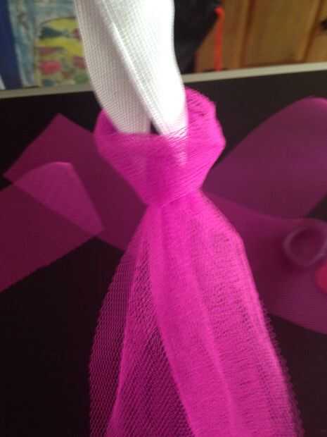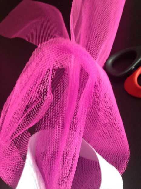 • Primero cortar el tul en 3 1/2 pulgadas X 1 metro. • Después de tu haber cortado tu tul, puede anudar en su primera parte muestra como las fotos de arriba. • Repetir la operación anterior hasta que haya llenado y completado el círculo entero.
