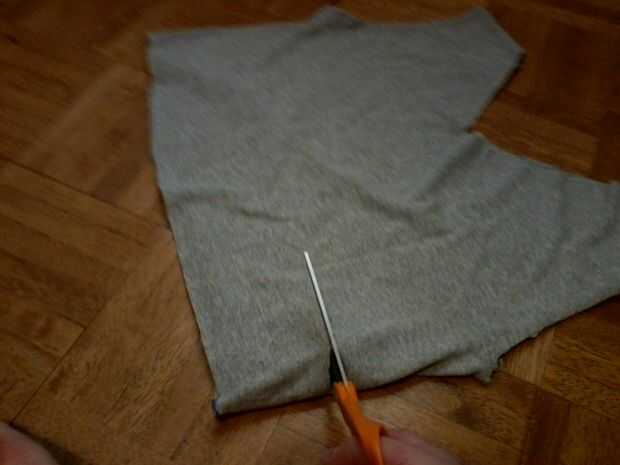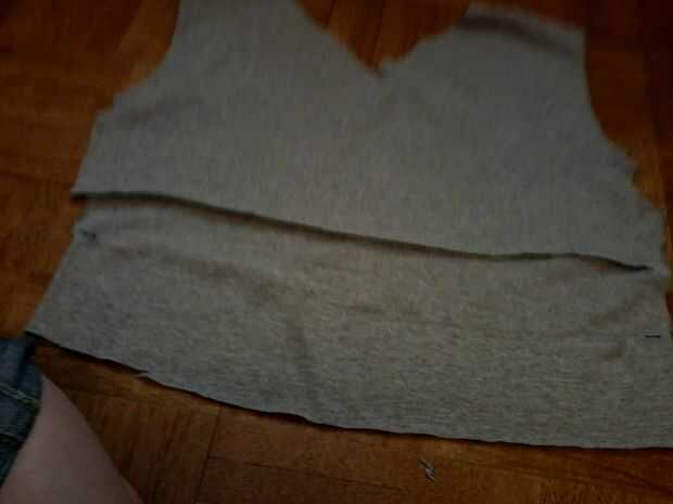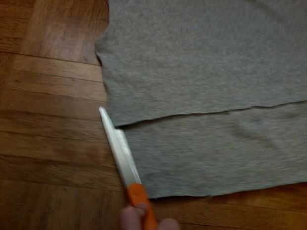 Voltee su camisa y marca unas 3 pulgadas de la parte inferior. Luego con cuidado corte una línea lisos en solamente la parte posterior de su camisa. Luego cortar sólo el lado de arriba donde usted a corta hasta donde la manga de la camisa solía ser.