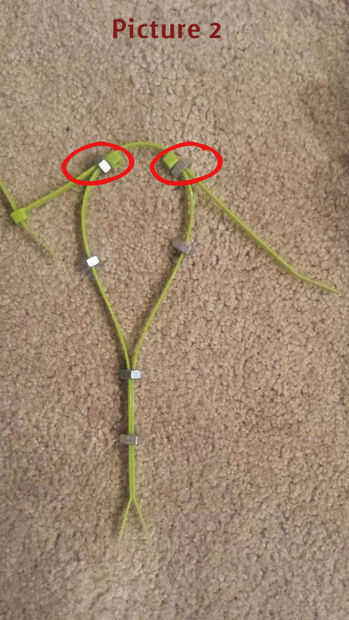 2. Enrosque los lazos zip a través de las tuercas. Asegúrese de que las cabezas de los lazos del cierre relámpago son al ras contra la amarra "L" horizontal (círculos rojos).