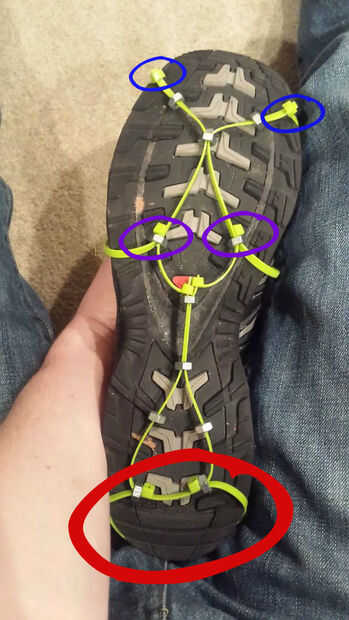 1. Deslice 2 lazos zip más de estas tuercas: (círculos de color púrpura). Se trata de su correa central.